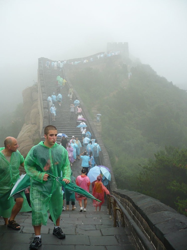 Walking on the famous Great Wall of China in rain and mist
