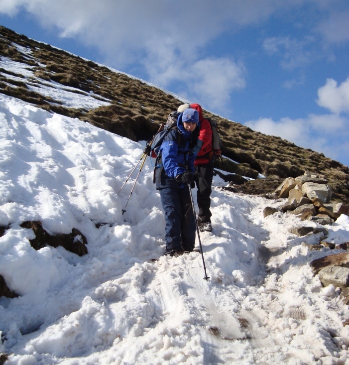 Hillwalkers braving the snow while descending towards Jacob's Ladder, Peak District, Easter 2010